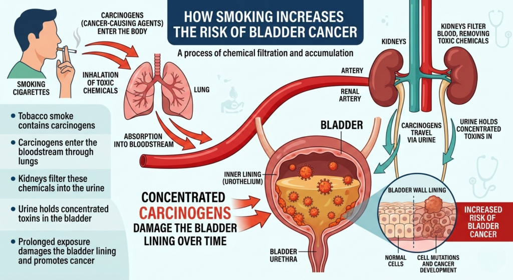 When you smoke, harmful chemicals from tobacco enter your bloodstream. These toxins are filtered by the kidneys and eventually stored in the bladder as urine. Over time, these chemicals damage the bladder lining, leading to cancer.